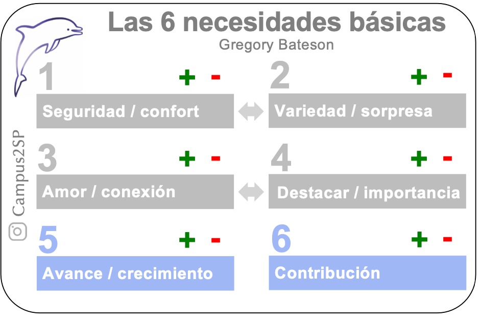 Gregory Bateson nos plantea el esquema de las 6 necesidades básicas. Por supuesto que no es una ciencia exacta, pero es muy esclarecedor y útil, al tiempo que hay que tomarlo cum grano salis, pues somos bien complejos.